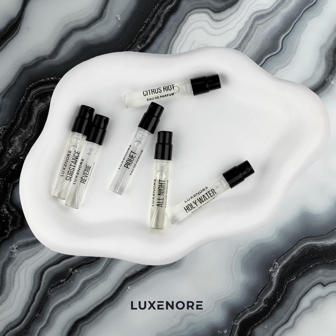 W zestawie znajdziesz 9 próbek naszych flagowych zapachów (każda o pojemności 1.5 ml, Wysoka koncentracja olejków): ALL NIGHT, SUBSTANCE, CITRUS RIOT, RÊVERIE, HOLY WATER, PIQUET, Luxenore No1, No2, No3. Całość zapakowana jest w elegancką, bawełnianą kosmetyczkę z napisem "feel BEAUTIFUL today"