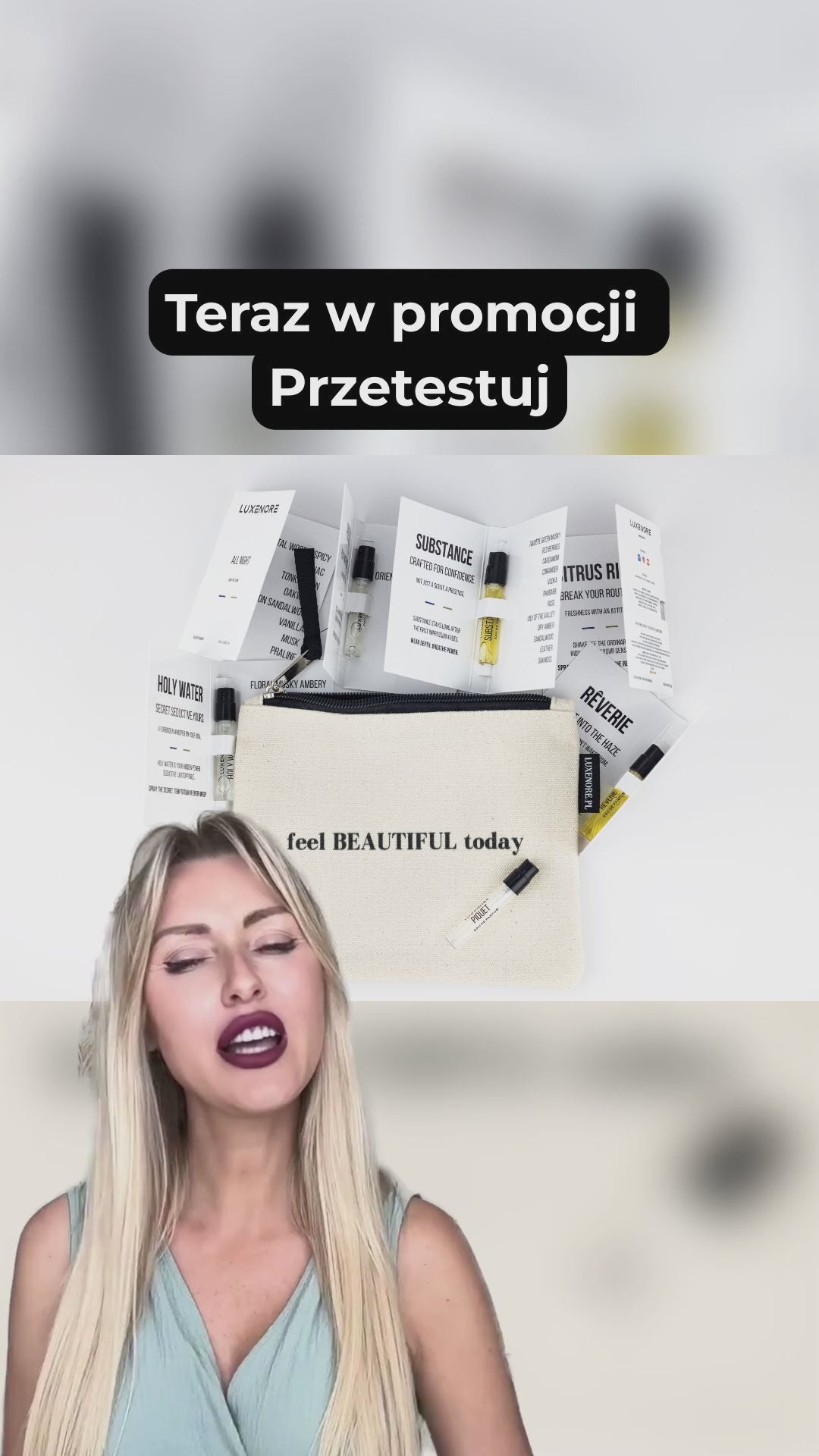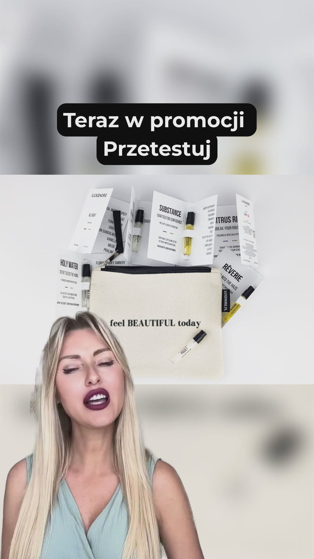 Poznaj pełną gamę zapachów LUXENORE dzięki wyjątkowemu zestawowi startowemu zawierającemu dziewięć próbek. Każdy zapach reprezentuje inny nastrój, osobowość i historię. Całość zapakowana została w bawełnianą kosmetyczkę z przesłaniem „feel BEAUTIFUL today”, która podkreśla wyjątkowość tego doświadczenia i którą możesz zabrać wszędzie — do torebki, plecaka czy na weekendowy wypad, także w podróż samolotem.